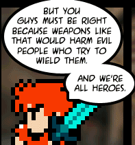 | Fighter | But you guys must be right because weapons like that would harm evil people who try to wield them. And we're all heroes. |