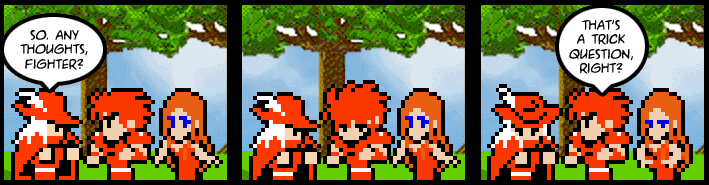 | Red Mage | (to Fighter) Okay, now let me make sure I've got this straight. We're up against a giant who has managed to take out 50% of our team with little effort. And now you and I have to brainstorm an ingenious plan of attack. |